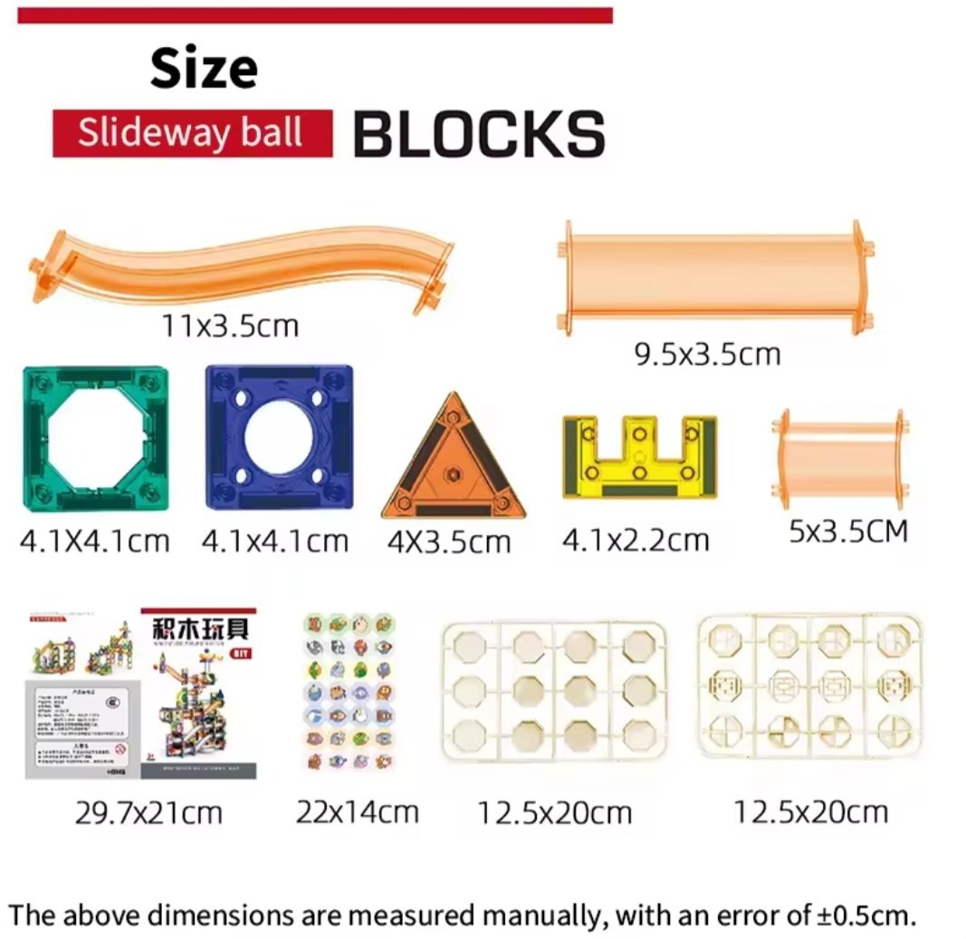 Комплектът включва различни видове писти – прави, извити, тунелни и спускащи се елементи. Прозрачният дизайн позволява на детето да следи движението на топчето по цялата траектория.